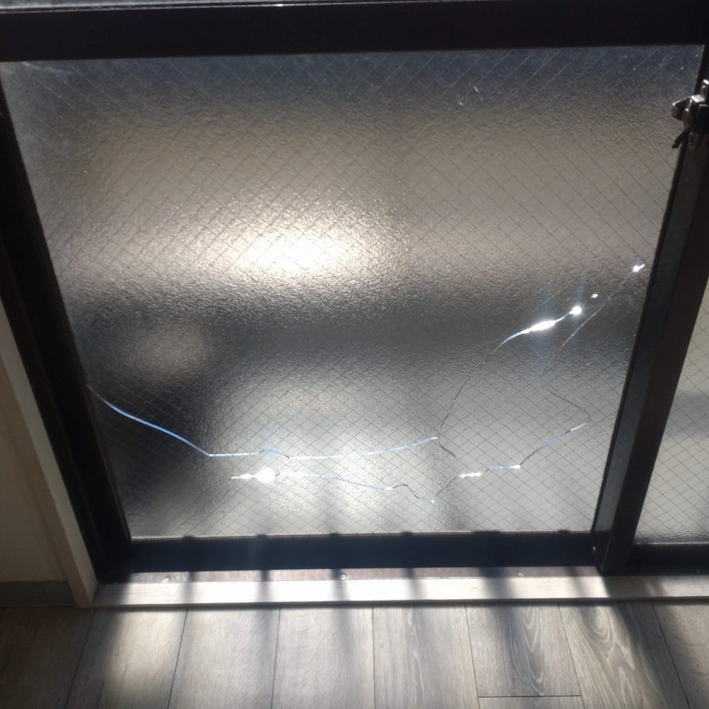ガラスが割れた原因は経年劣化によるサビ割れと温度差による熱割れかと思います