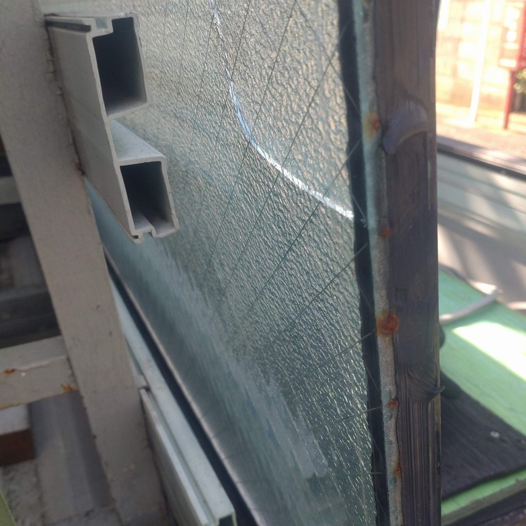 ガラスが割れた原因は経年劣化によるサビ割れと温度差による熱割れかと思います