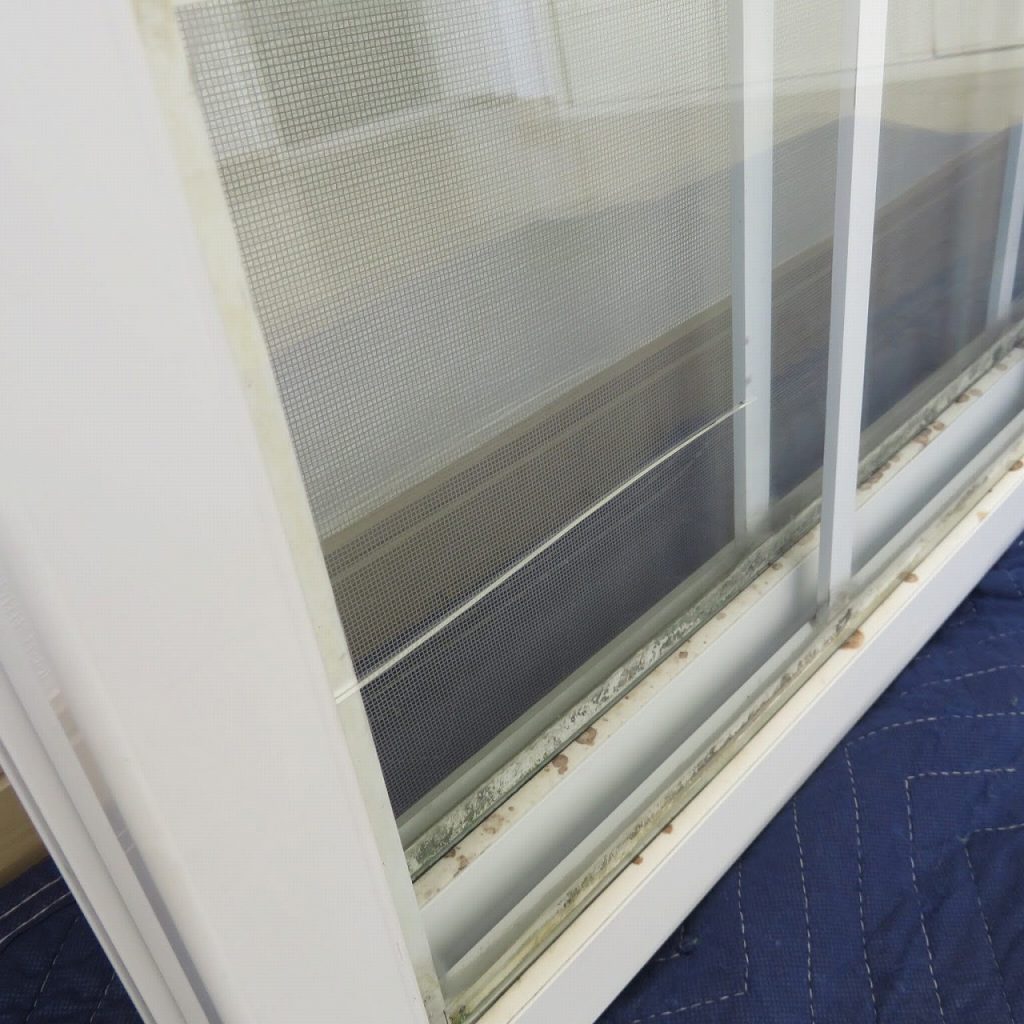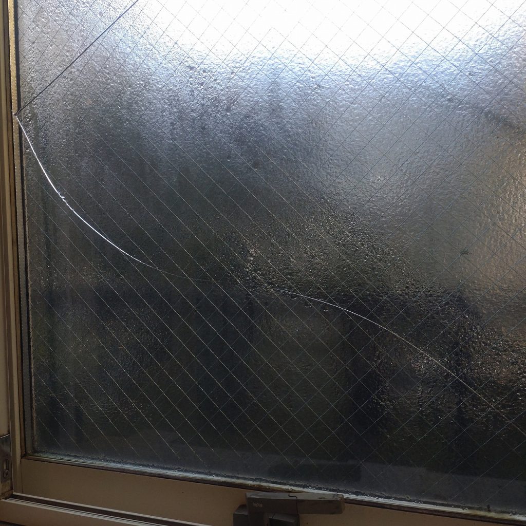 窓ガラスが割れた原因は上段は温度差による熱割れ下段は経年劣化によるサビ割れと思います