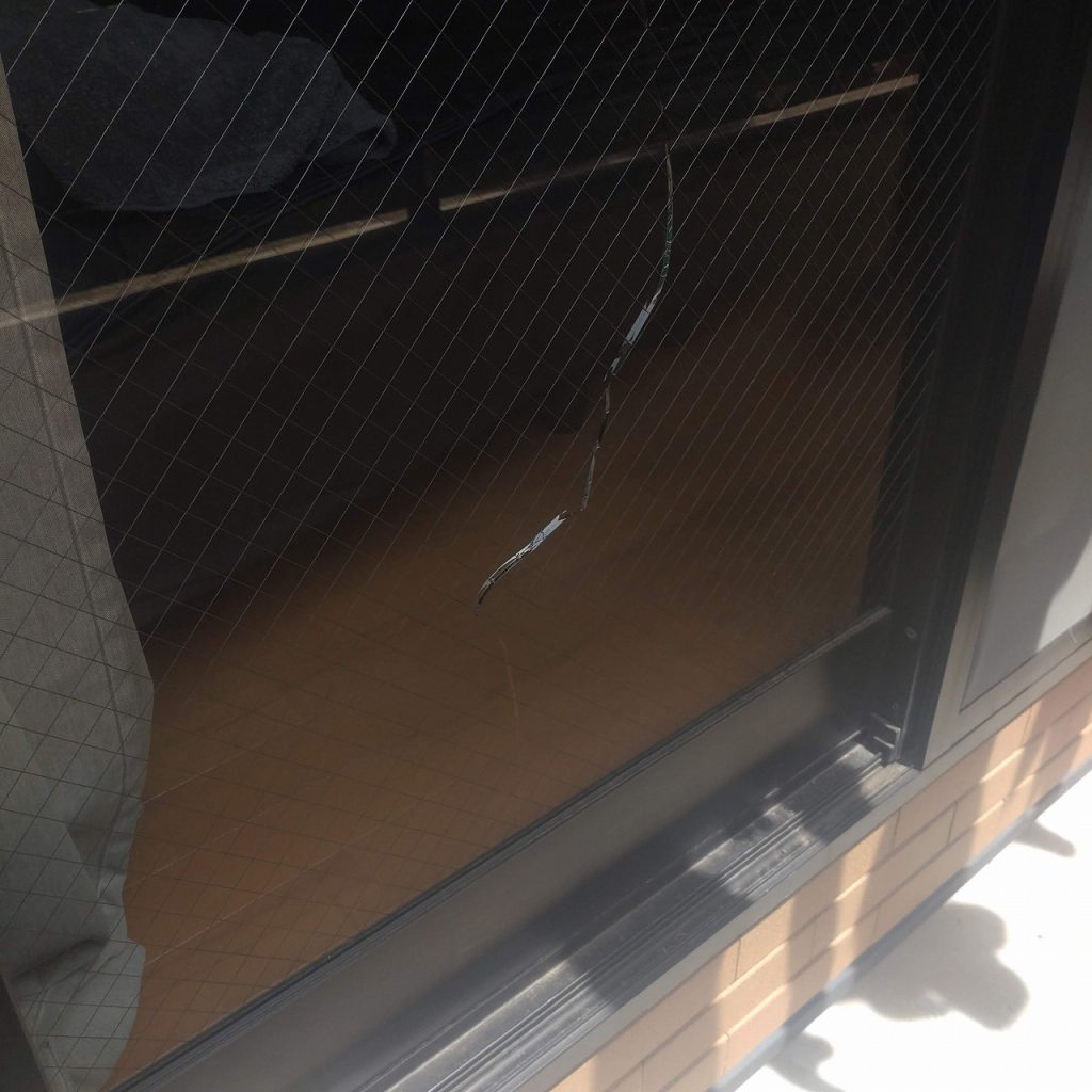 ガラスが割れた原因は物がぶつかったのだと思われます