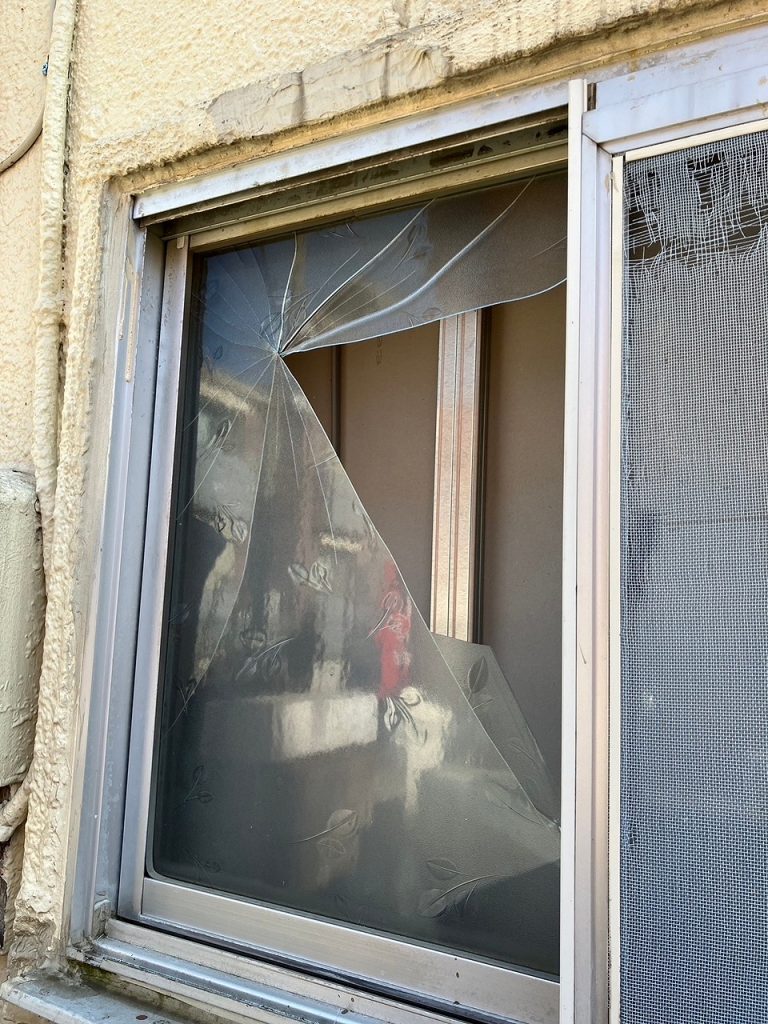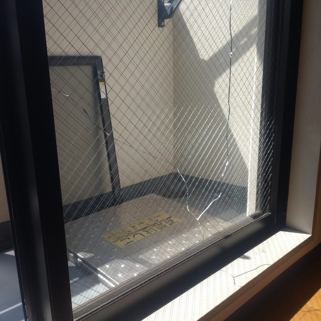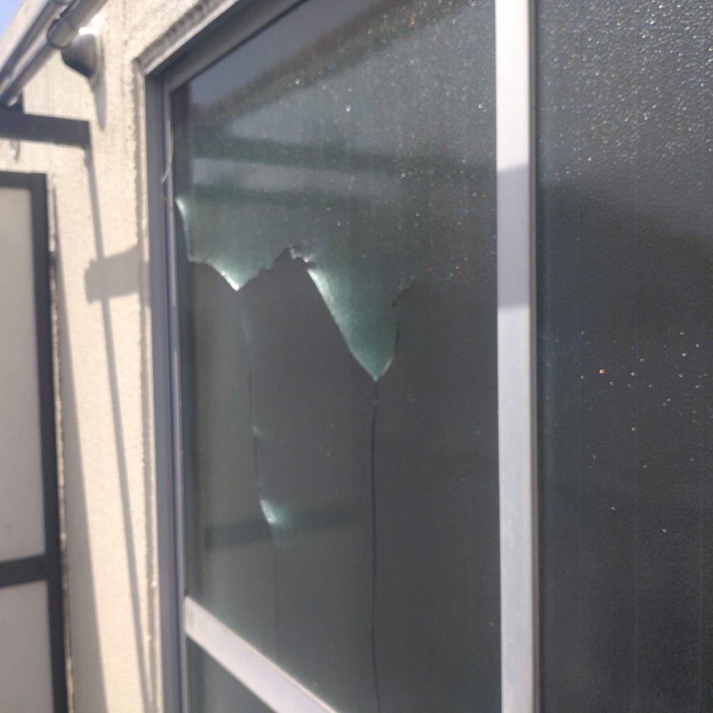 ガラスが割れた原因は物が当たって割れたと考えられます