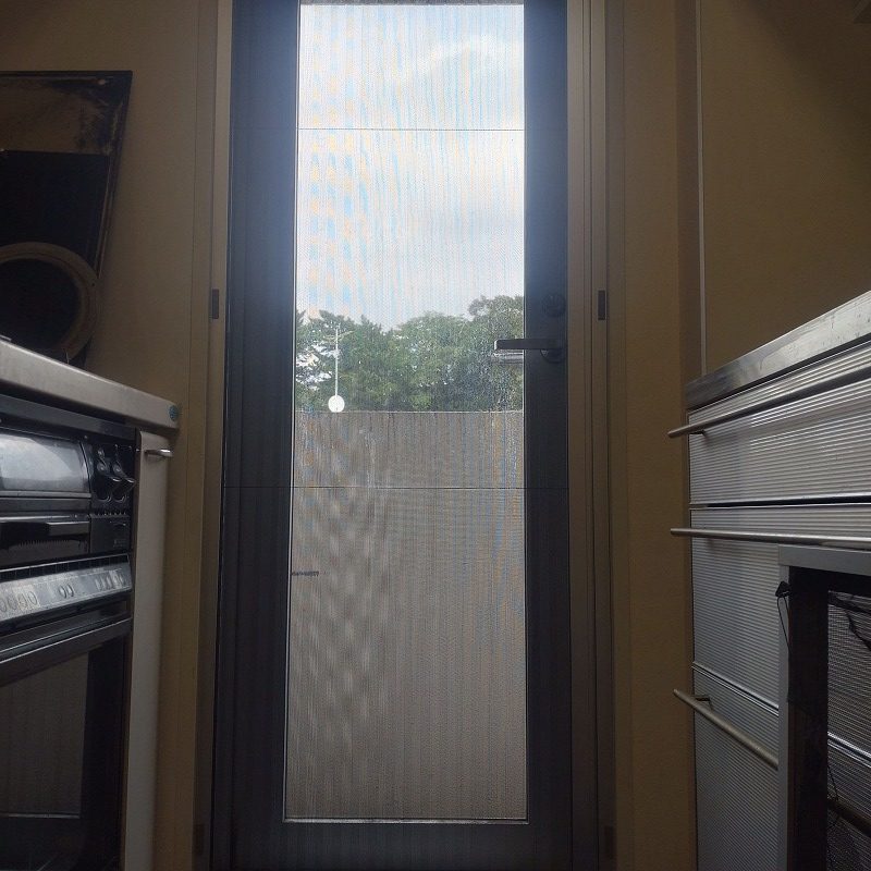 マンションキッチン勝手口のプリーツ網戸(アコーディオン網戸)交換工事になります