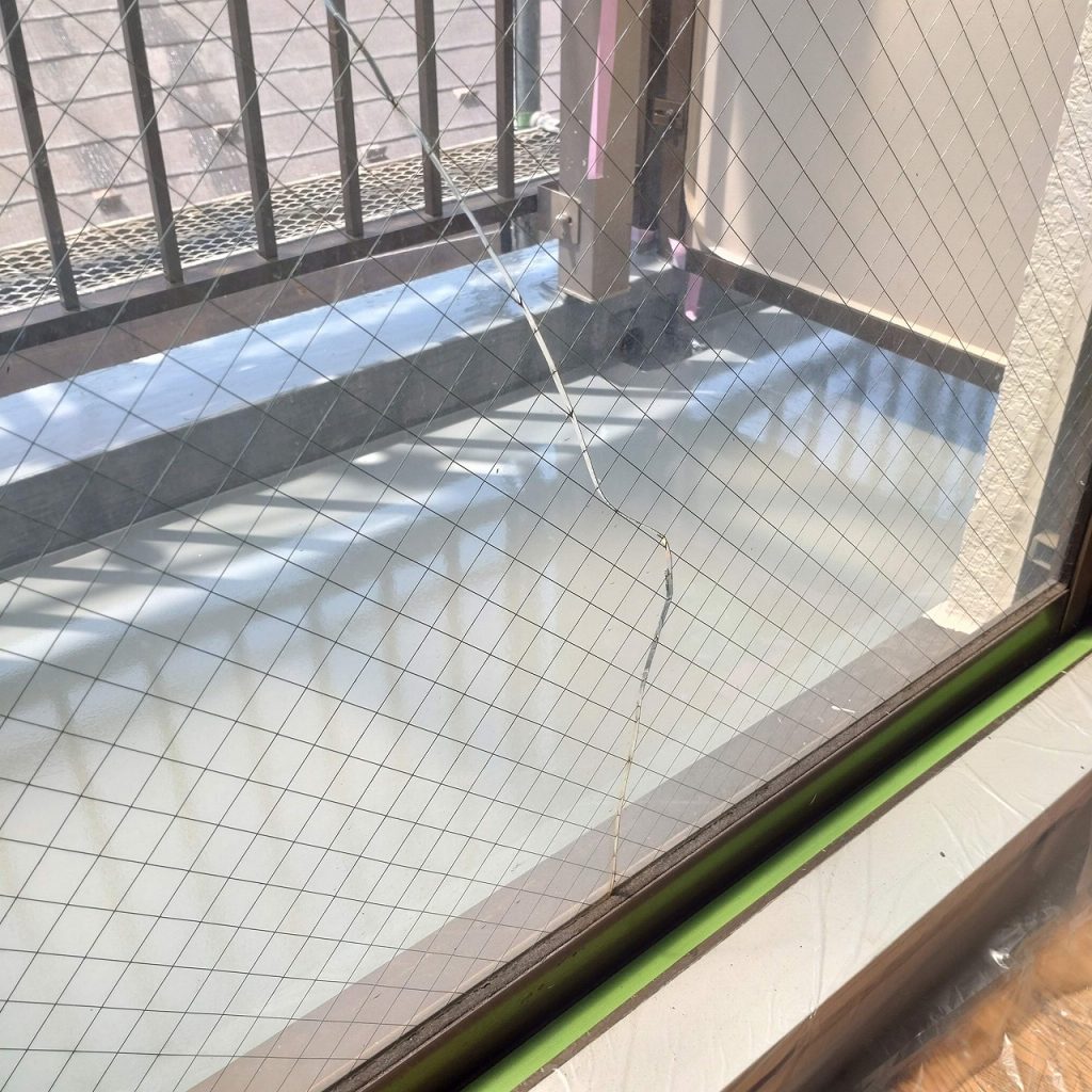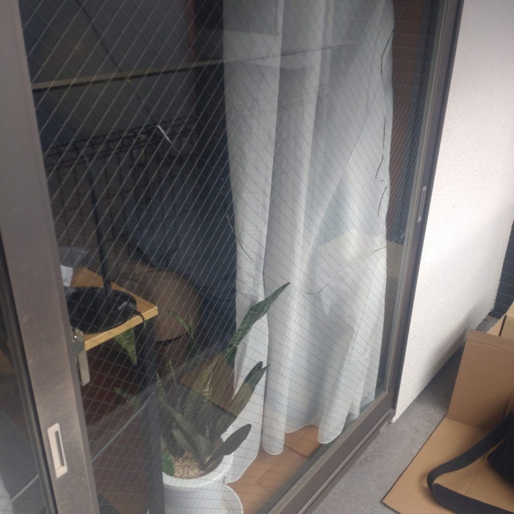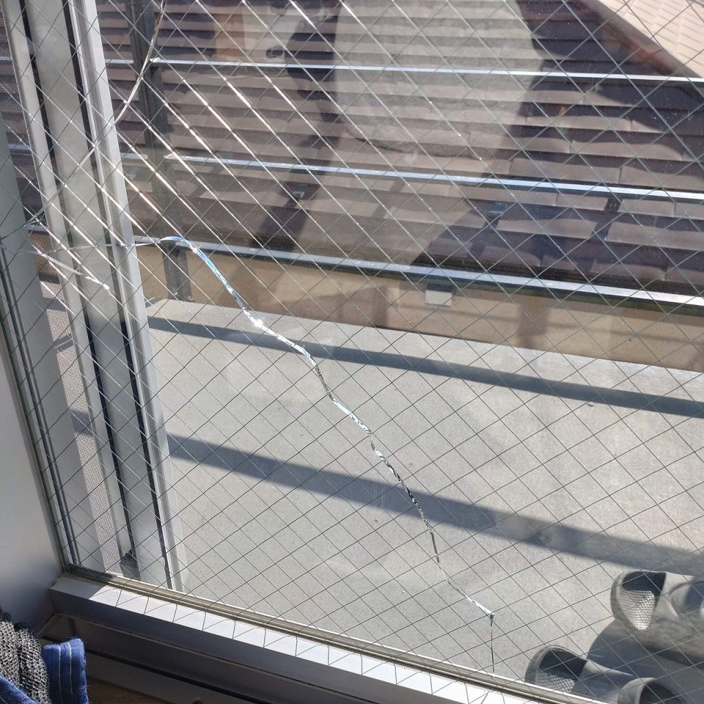 窓ガラスが割れた原因が熱割れでしたので菱形網入り透明ガラスからマイボーカガラスへの交換となりました