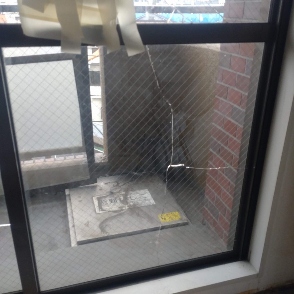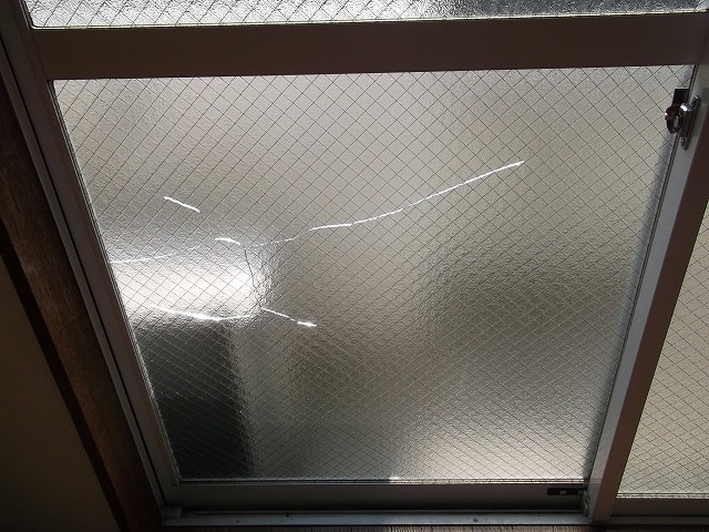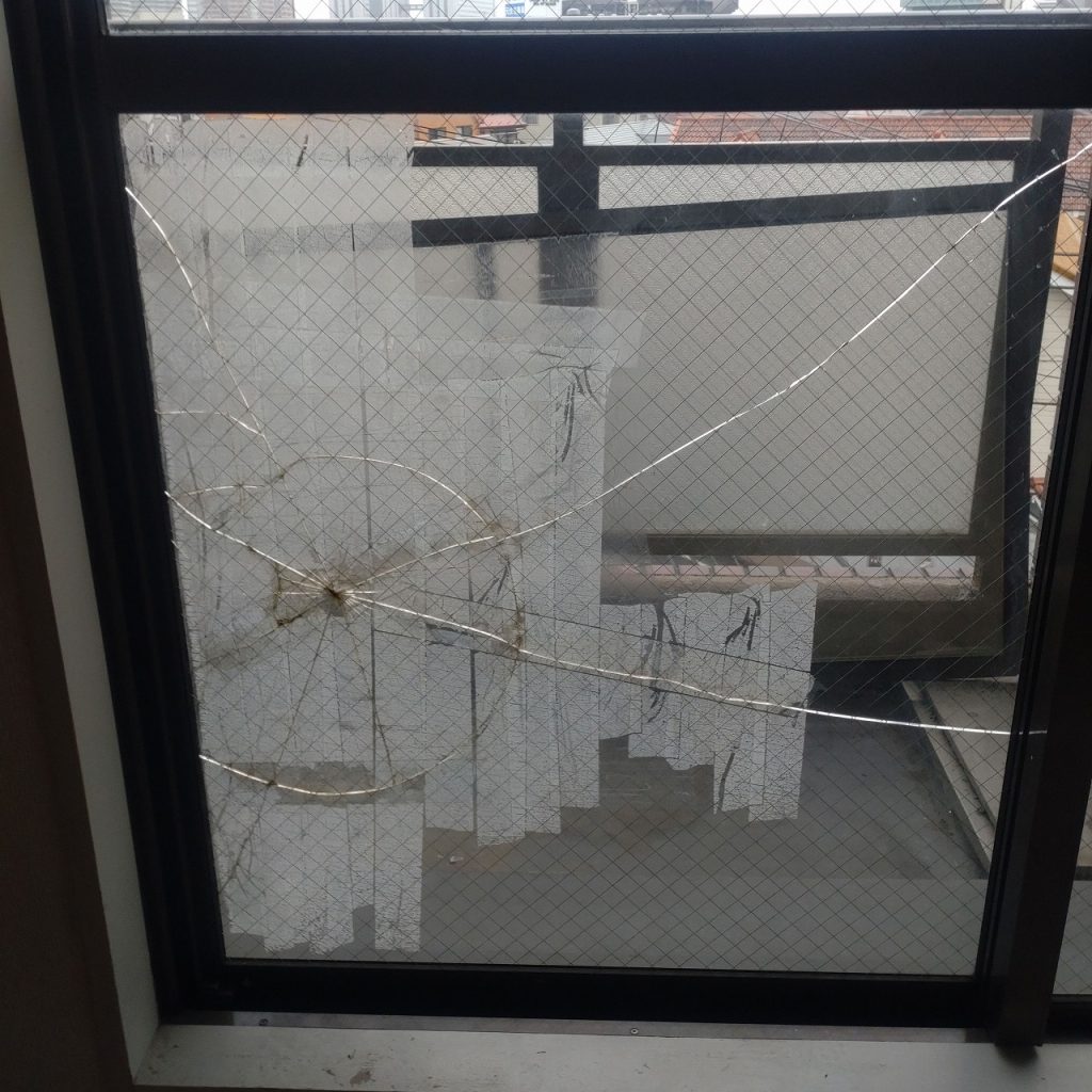物が当たって割れた掃き出し窓ガラスです